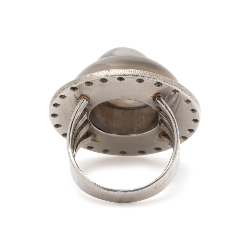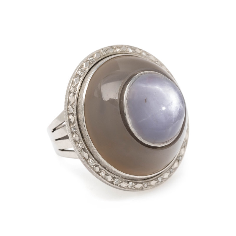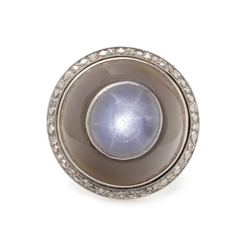 Containing one round cabochon star sapphire measuring approximately 13.00 mm in diameter, carved hardstone surround and 24 single cut diamonds. Mounted in platinum. Ring size 6.