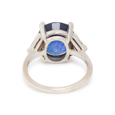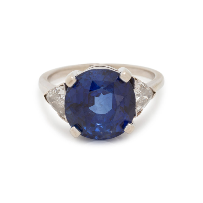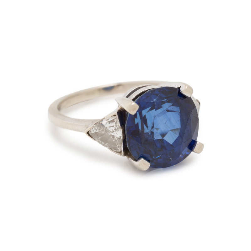 Containing one cushion mixed cut sapphire measuring approximately 11.13 x 10.89 x 8.00 mm and two triangular brilliant cut diamonds weighing approximately 0.65 carat total. Mounted in white gold. Ring size 6 1/2.