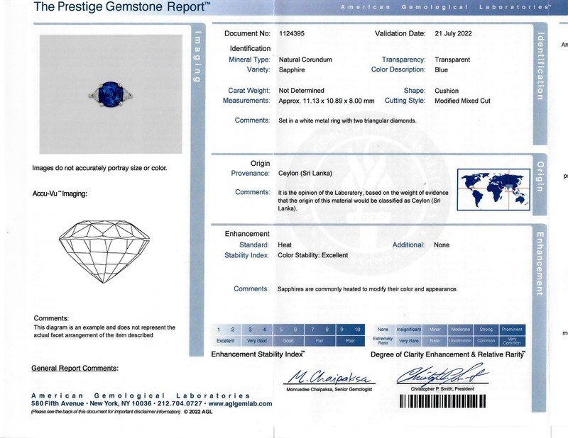 AGL, 2022, Report No. 1124395, Natural Corundum, Sapphire, Ceylon (Sri Lanka), Heated