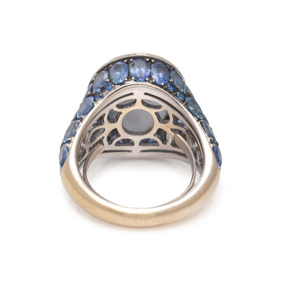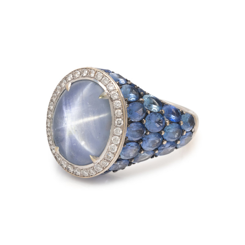 Containing one oval cabochon star sapphire measuring 13.92 x 10.84 x 6.06 mm, numerous oval and round mixed cut sapphires and 32 round brilliant cut diamonds weighing approximately 0.25 carat total. Mounted in white gold. Ring size 6.