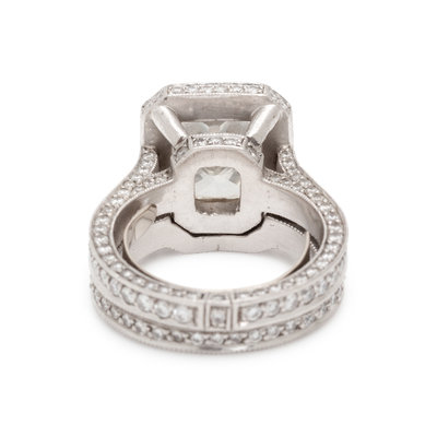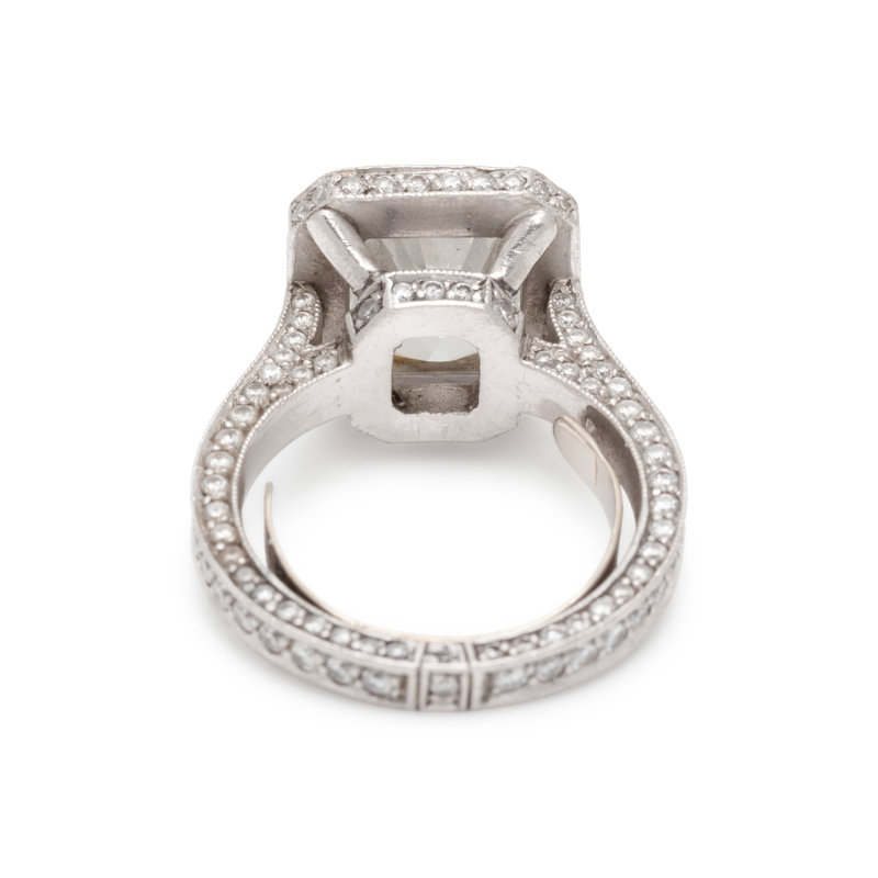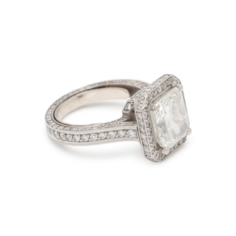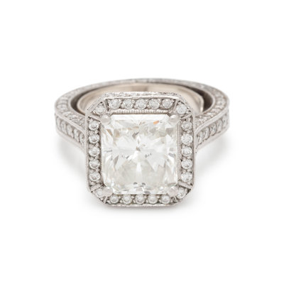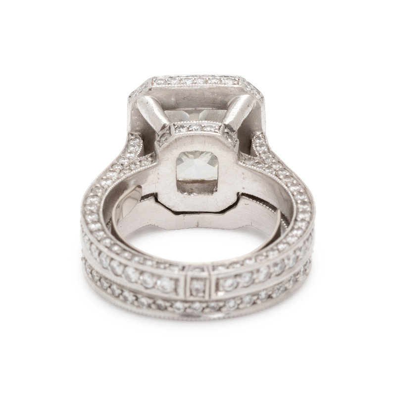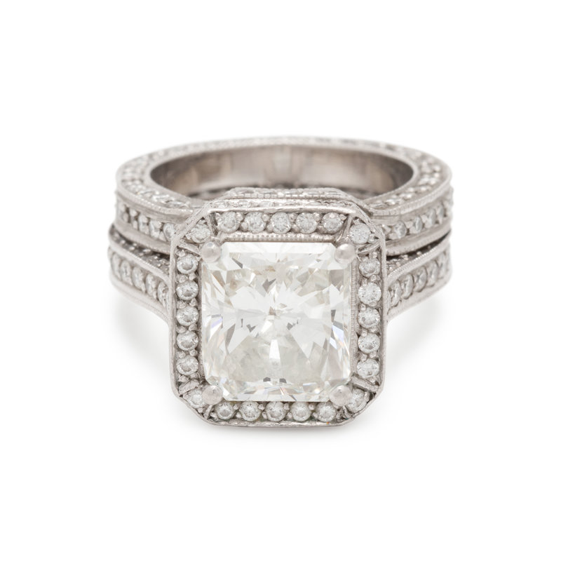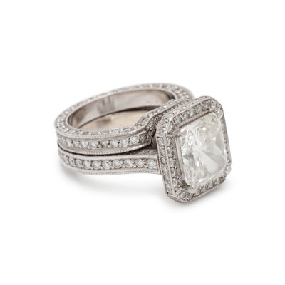 Consisting of a ring containing one cut-cornered rectangular modified brilliant cut diamond weighing 4.00 carats and 193 round brilliant cut diamonds weighing approximately 1.15 carats total, together with fitted band containing 101 round brilliant cut diamonds weighing approximately 0.60 carat total. Mounted in platinum. Ring sizes 4 3/4 and 5.