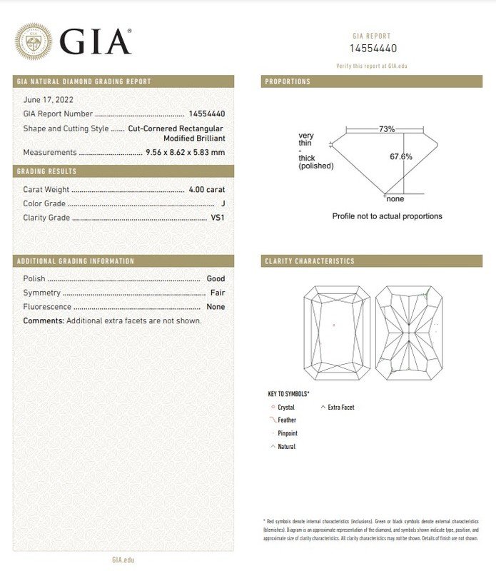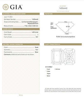 GIA, 2022, Report No. 14554440, 4.00 carats, J color, VS1 clarity, No fluorescence