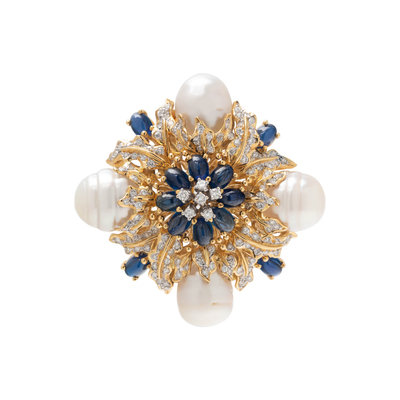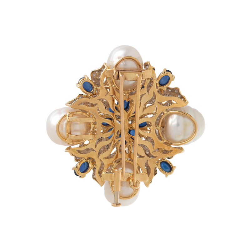Containing 12 oval cabochon sapphires, numerous round brilliant cut diamonds weighing approximately 2.00 carats total and four oval shaped pearls. Mounted in yellow gold. 2 x 2 inches.