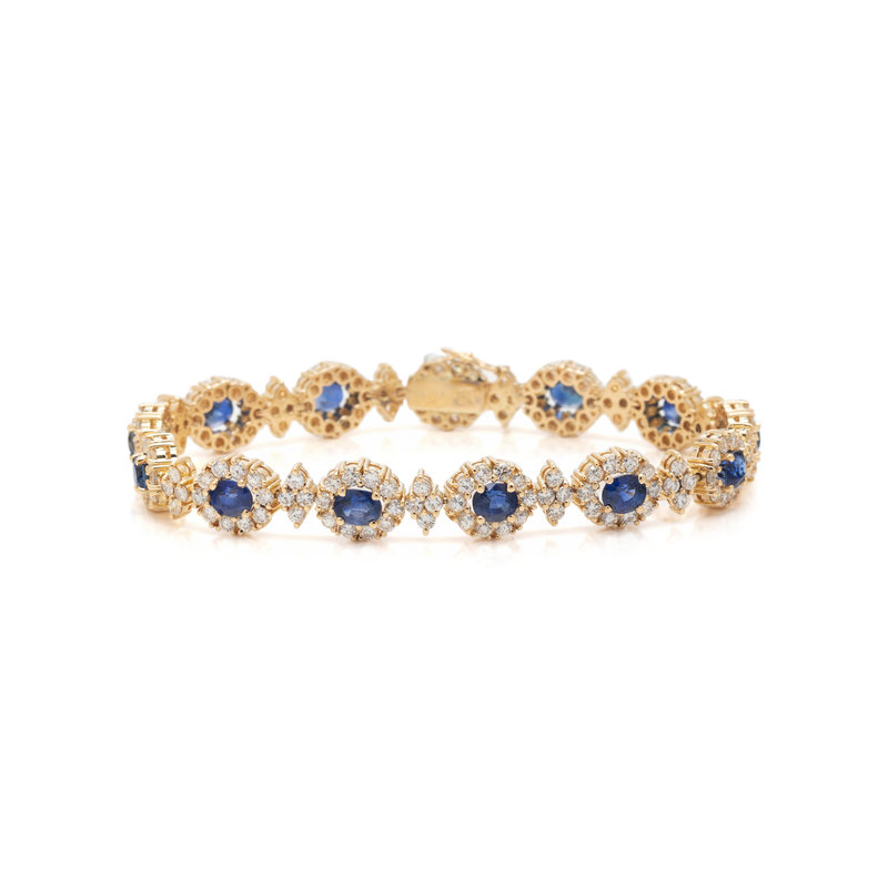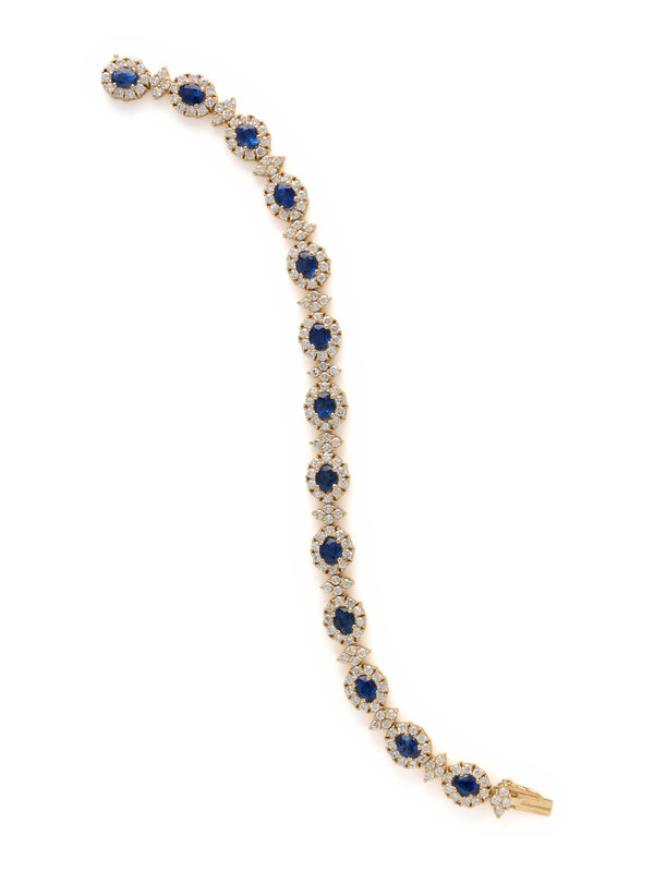 Containing 13 oval mixed cut sapphires measuring approximately 5.00 x 4.00 mm and numerous round brilliant cut diamonds weighing approximately 4.00 carats total. Mounted in yellow gold. 6 3/4 inches long.
