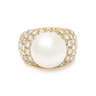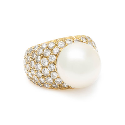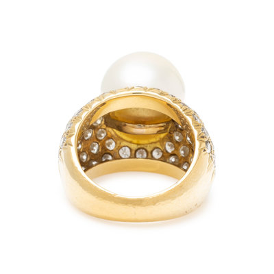 Containing one South Sea pearl measuring approximately 13.00 mm in diameter and 72 round brilliant cut diamonds weighing approximately 2.85 carats total. Mounted in yellow gold. Ring size 5 1/4.