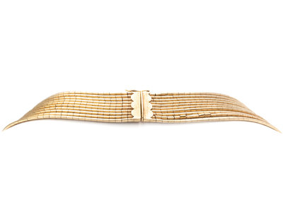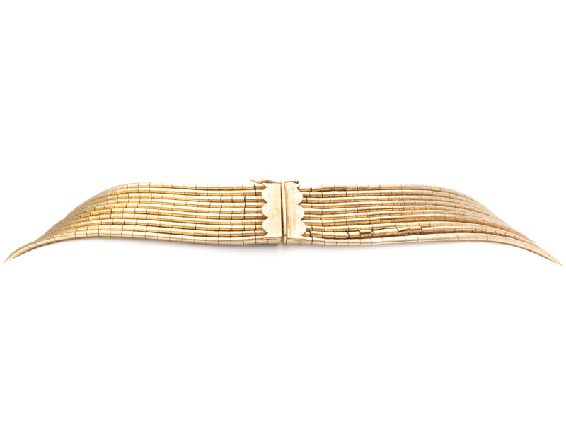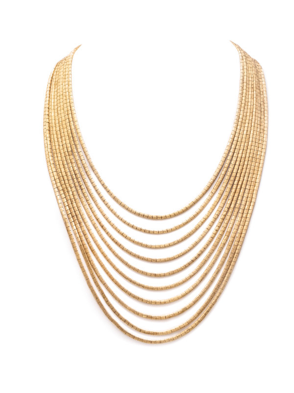 Consisting of 10 strands of textured gold links. 18-25 inches long.