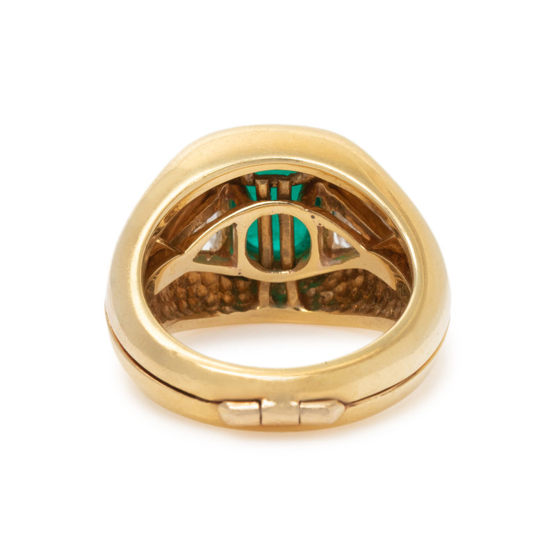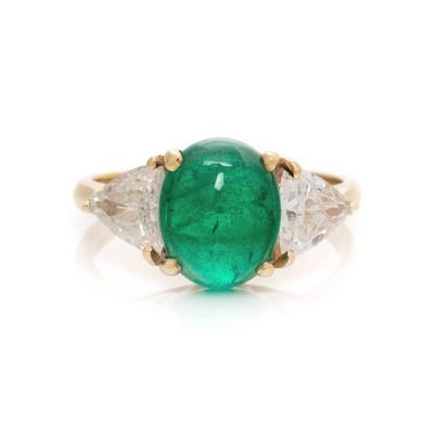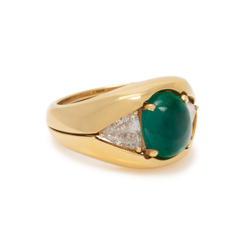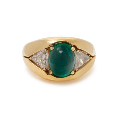Consisting of a ring containing one oval cabochon emerald measuring approximately 10.00 x 8.05 x 5.40 mm and two triangular shaped diamonds weighing approximately 1.05 carats total, with removable ring jacket. Ring size 6 1/4.