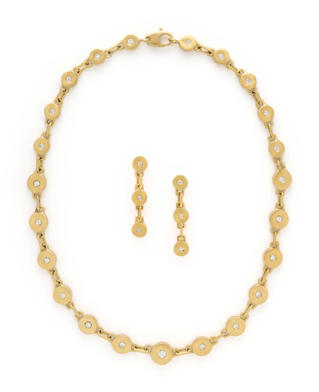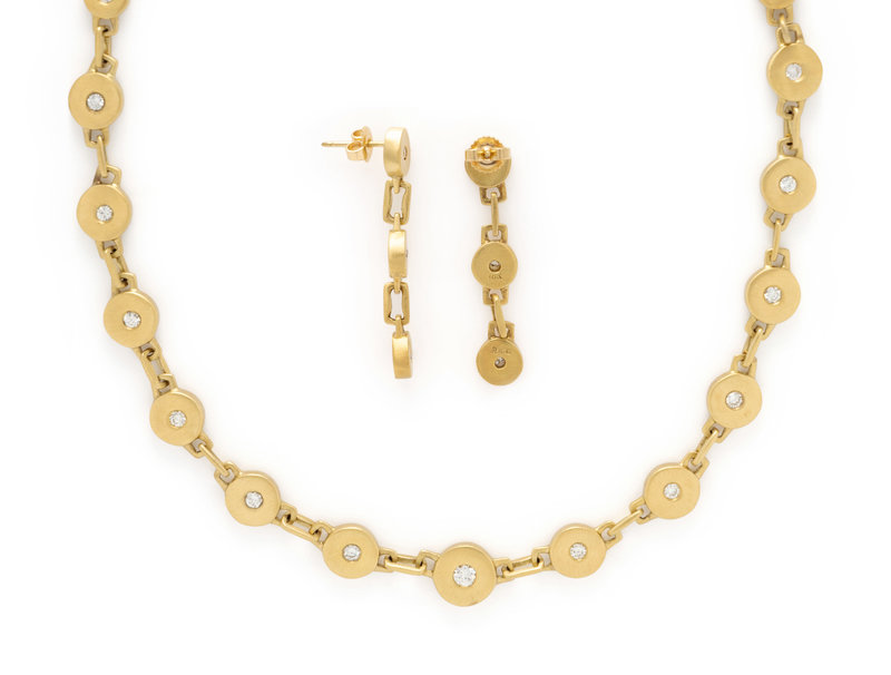 Consisting of a brushed gold necklace containing 23 round brilliant cut diamonds weighing approximately 1.50 carats total, together with a pair of earrings containing six round brilliant cut diamonds weighing approximately 0.15 carat total. Necklace: 16 inches long. Earrings: 1 1/2 inches long.