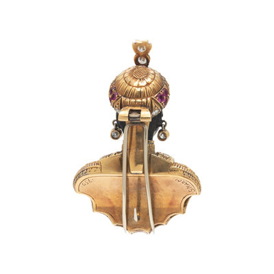 Consisting of a carved male figure with yellow gold mounts with engraved detail containing 22 round brilliant cut diamonds weighing approximately 1.50 carats total and 12 round mixed cut rubies. 1 7/8 x 1 1/4 inches.