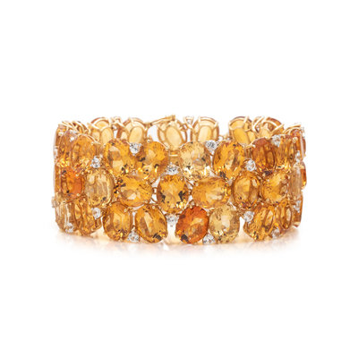 Containing numerous oval mixed cut citrines in various shades and numerous round mixed cut colorless sapphires. Mounted in yellow gold. 7 1/4 inches long.