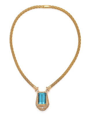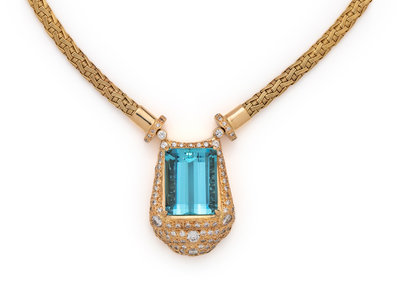 YELLOW GOLD, AQUAMARINE AND DIAMOND NECKLACE