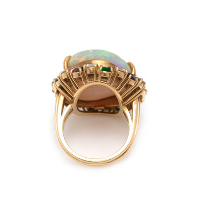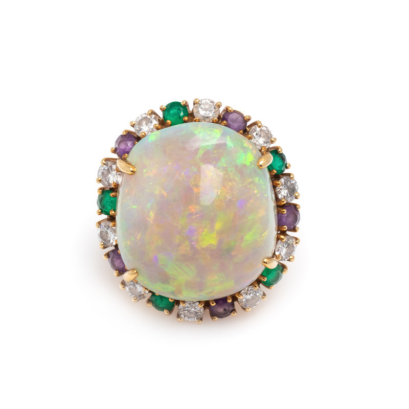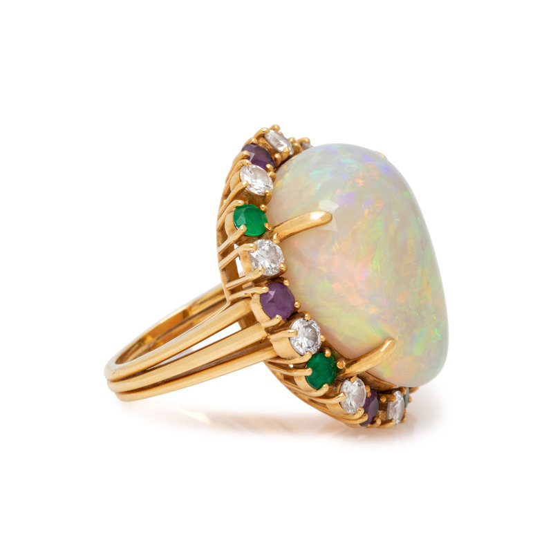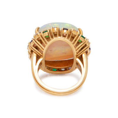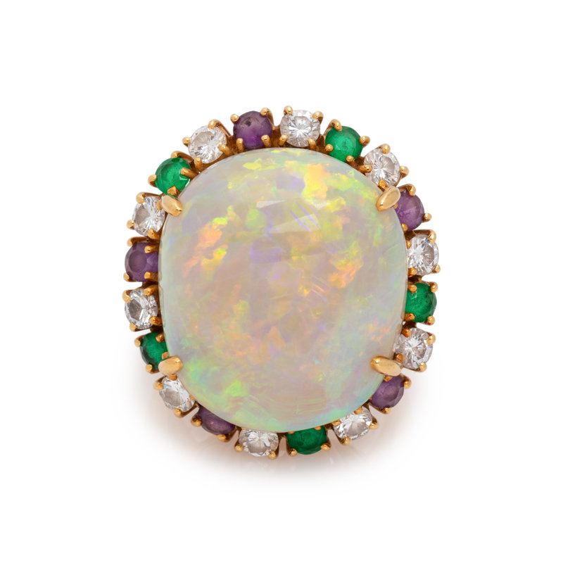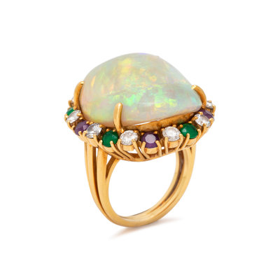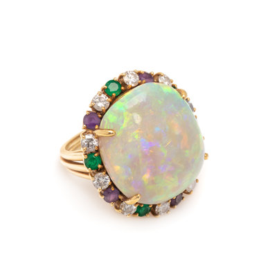 Containing one freeform cabochon opal measuring approximately 21.45 x 19.30 mm, 10 round brilliant cut diamonds weighing approximately 1.20 carats total, five round mixed cut emeralds and five round mixed cut amethysts. Mounted in yellow gold. Ring size 6.