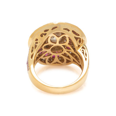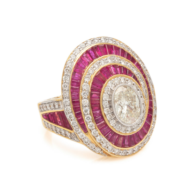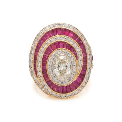 Containing one oval shaped diamond weighing approximately 0.95 carat, numerous calibre cut rubies and numerous round brilliant cut diamonds weighing approximately 1.05 carats total. Mounted in yellow gold. Ring size 6.