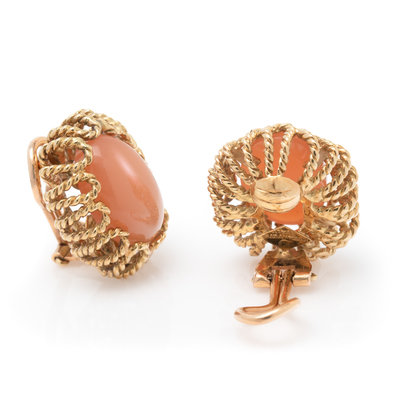 TIFFANY & CO., YELLOW GOLD AND ORANGE CAT'S EYE MOONSTONE EARCLIPS