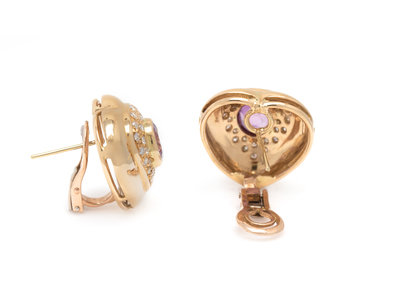 FRENCH, YELLOW GOLD, PINK SAPPHIRE AND DIAMOND EARCLIPS