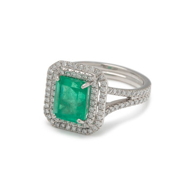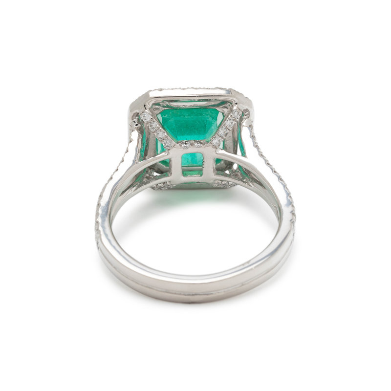 Containing one emerald cut emerald measuring 8.99 x 7.20 x 6.66 mm and numerous round brilliant cut diamonds weighing approximately 0.75 carat total. Mounted in platinum. Ring size 6 1/2.
