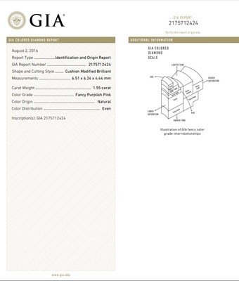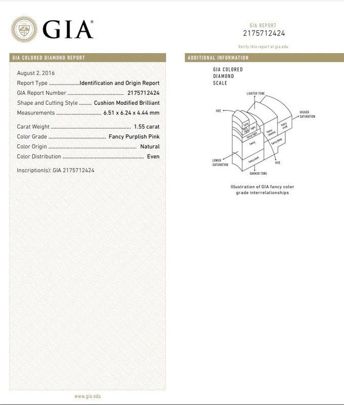 GIA, 2016, Report No. 2175712424, 1.55 carats, Fancy purplish pink color
