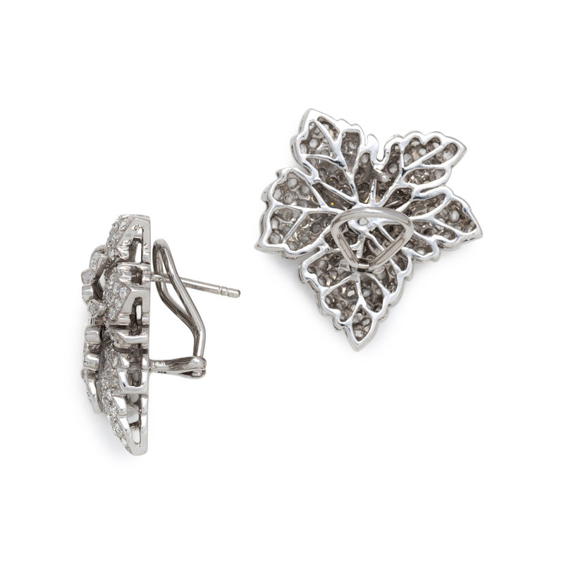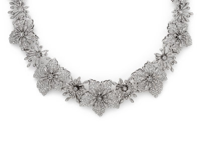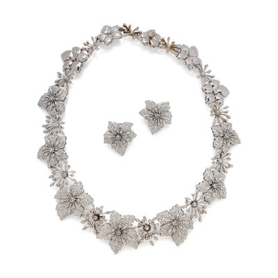 Consisting of a collar necklace and matching earclips, posts with clip backs, containing numerous rose cut diamonds weighing approximately 24.00 carats total. Mounted in white gold. Necklace: 17 inches inner circumference. Earclips: 1 inch long.
