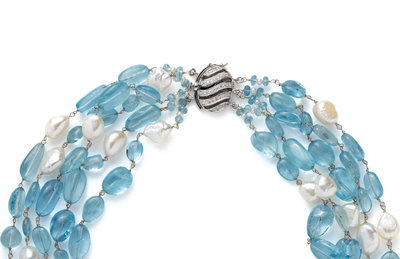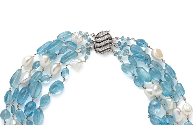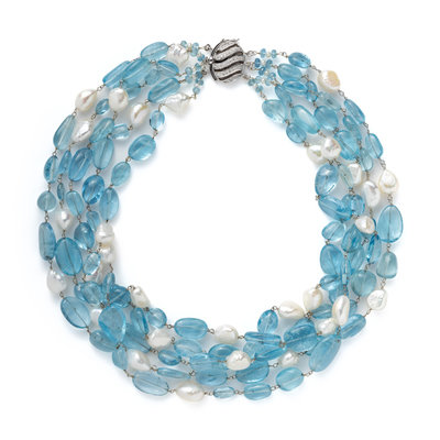 Consisting of five strands of tumbled aquamarine and freshwater pearl beads, with platinum wire links and white gold clasp containing 40 round brilliant cut diamonds. 16 1/2-18 inches long.