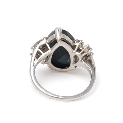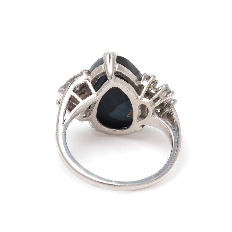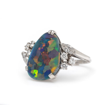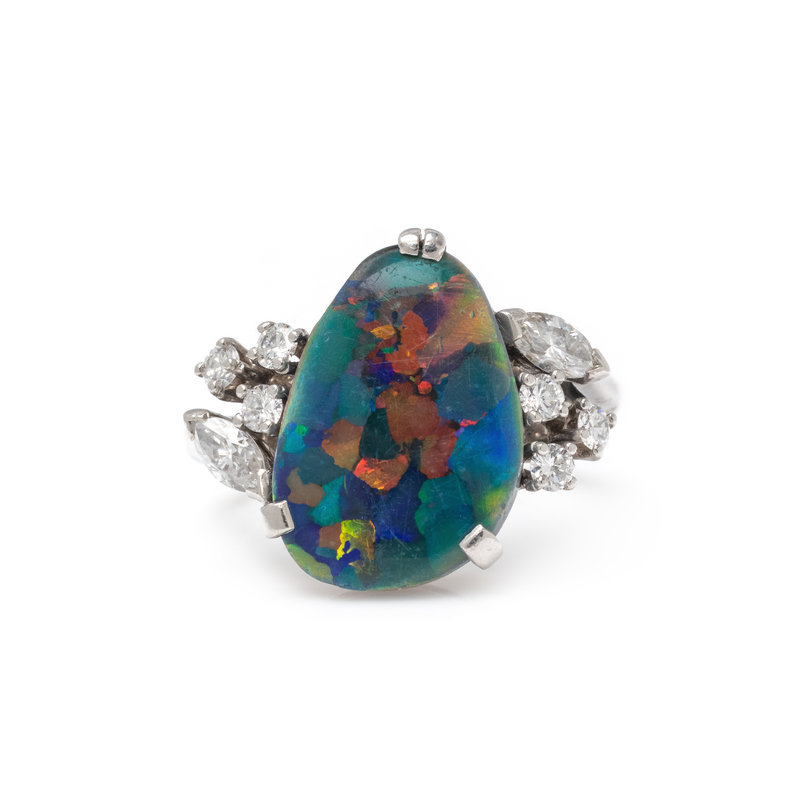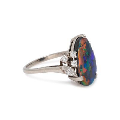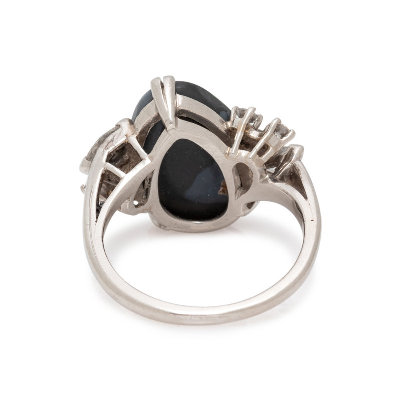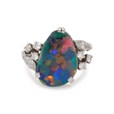 Containing one freeform black opal measuring approximately 15.50 x 11.30 mm, two marquise and six round brilliant cut diamonds weighing approximately 0.55 carat total. Mounted in platinum. Ring size 6 1/2.