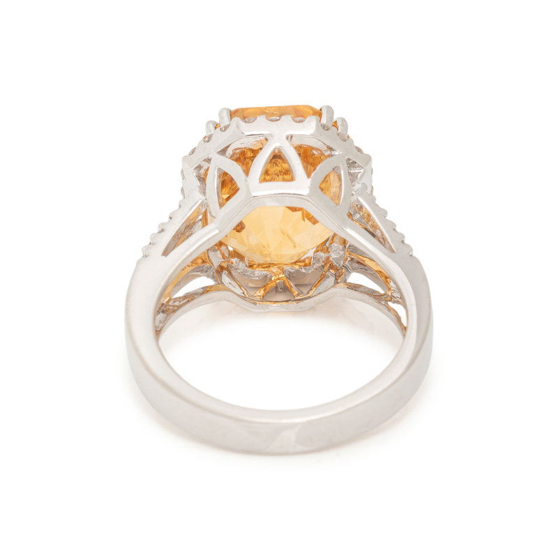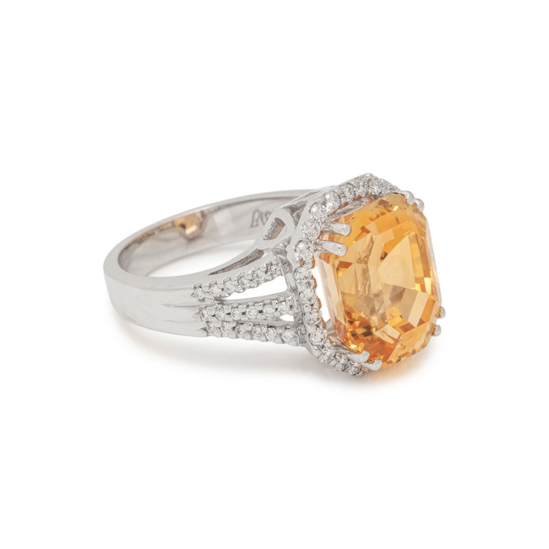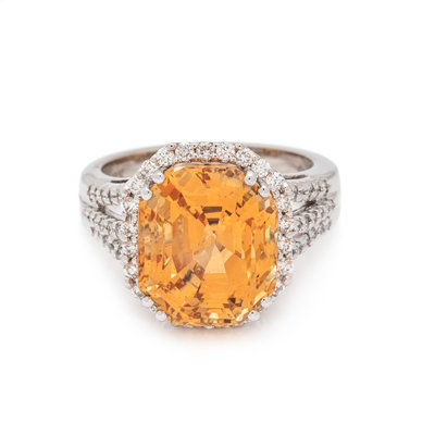 Containing one octagonal step cut orange-yellow sapphire measuring approximately 13.12 x 11.13 x 9.78 mm and 62 round brilliant cut diamonds weighing approximately 0.65 carat total. Mounted in white gold. Ring size 7.