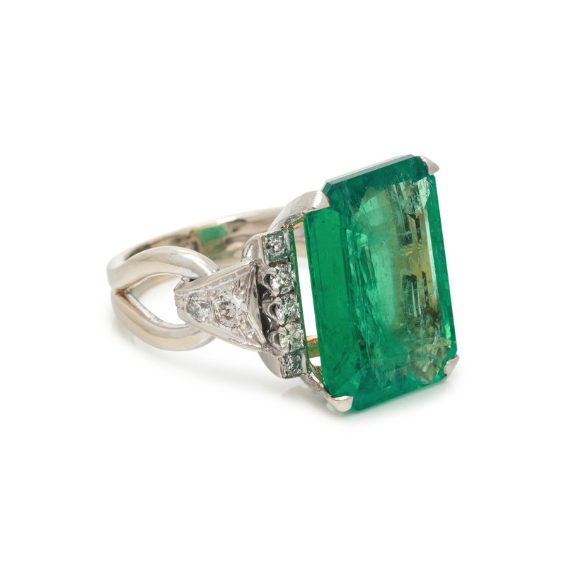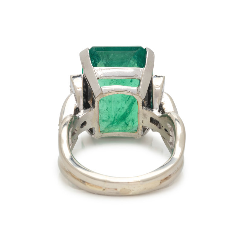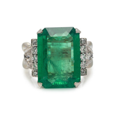 Containing one emerald cut emerald measuring 18.44 x 13.03 x 7.12 mm and 14 round brilliant cut diamonds weighing approximately 0.65 carat total. Mounted in white gold. Ring size 8 1/2.