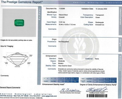 AGL, 2022, Report No. 1120266, Natural Beryl, Emerald, Moderate-Modern clarity enhancement