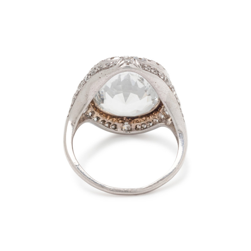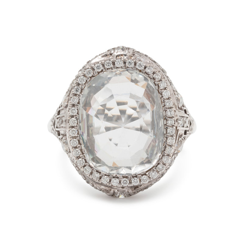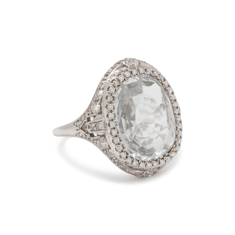 Containing one oval mixed cut colorless sapphire measuring approximately 15.05 x 12.05 x 4.80 mm and numerous old European, single and round brilliant cut diamonds weighing approximately 0.90 carat total. Mounted in platinum. Ring size 8.