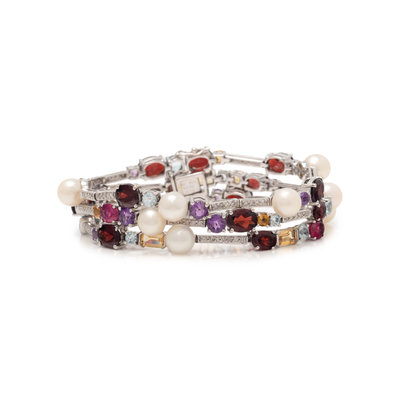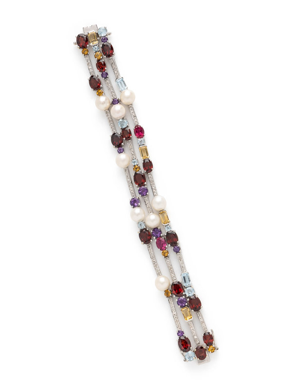 Containing numerous oval, round and emerald cut gemstones including garnet, pink tourmaline and citrine, eight pearls and numerous round brilliant cut diamonds weighing approximately 1.10 carats total. Mounted in white gold. 6 3/4 inches long.