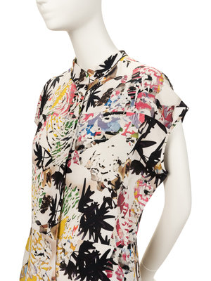 White silk sleeveless dress with multicolored abstract print, mandarin collar, large waistband, flared skirt, two side slit pockets, and front zipper closure.