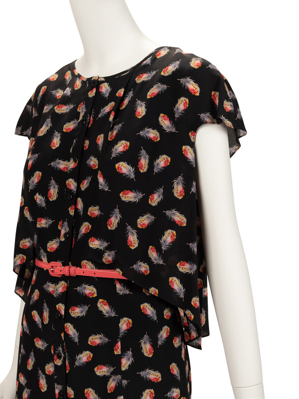 Black silk short sleeve dress with jewel neckline, pink, yellow, and white printed feather pattern, bodice flap, and center front button closure with detachable pink belt. Item retains merchandising labels.