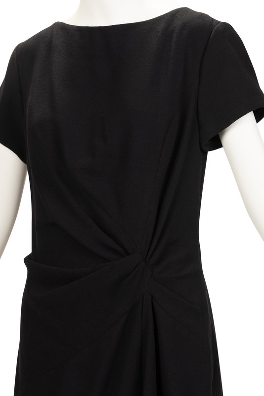 Black crepe dress with scoop neckline, set in short sleeves, gathering to the left side, and invisible center back zipper closure.