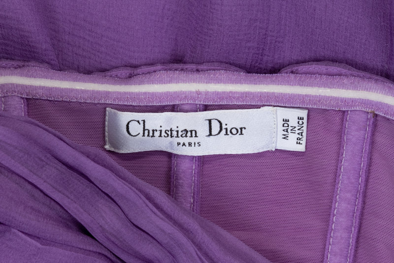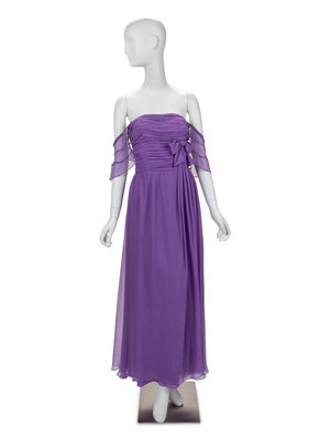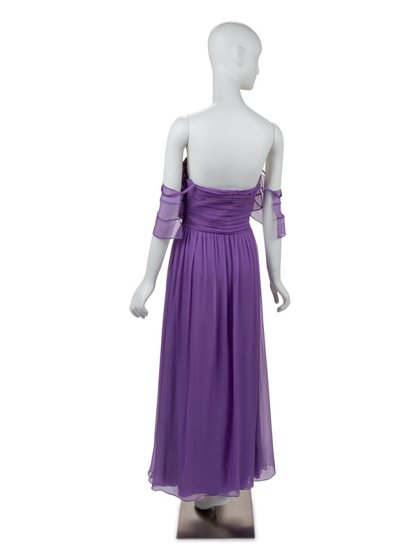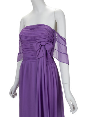 Purple chiffon dress with spaghetti straps, sleeve ruffle, ruched bodice with bow, long skirt, built in boned bodice, and invisible side zipper closure.
