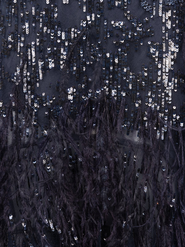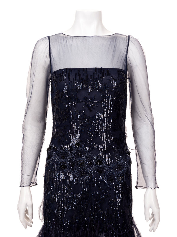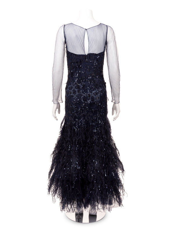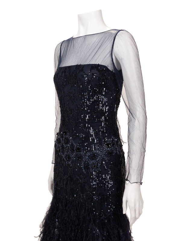 Navy silk net evening dress embellished with sequins, beads, and ostrich feathers, net upper bodice and sleeves, flared hemline, and center back zipper closure.