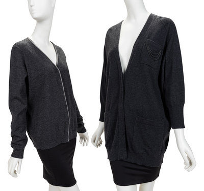 Grey cashmere knit top with v-neckline and monili trim, long sleeves, silver beaded trim, ribbed knit hems, and center front snap closure.