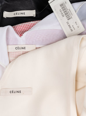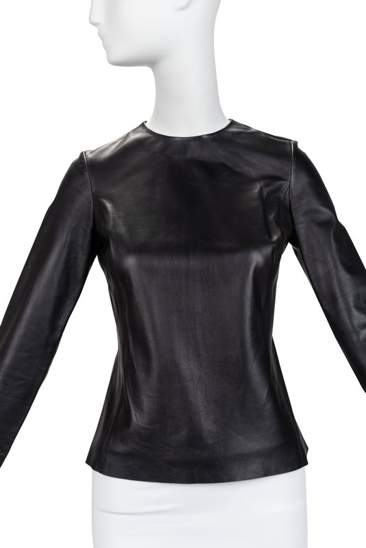 Black leather top with crew neckline, set in long sleeves, and center back zipper closure. Item retains merchandising labels with a retail price of $2,900.