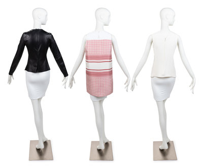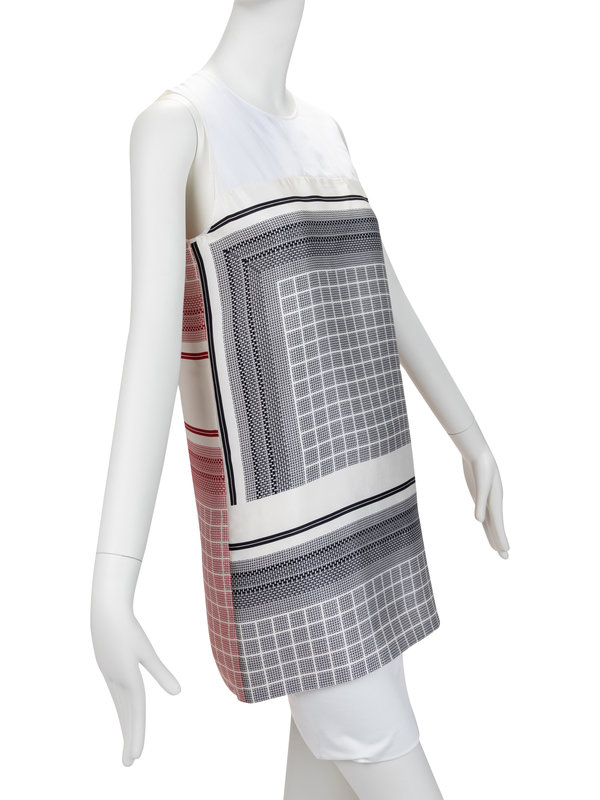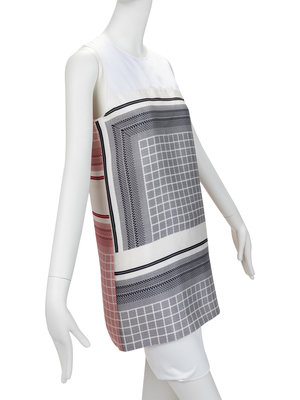 White silk sleeveless top with black geometric center front print and red geometric print on the center back, and keyhole back closure; paired with see-through white silk slip.