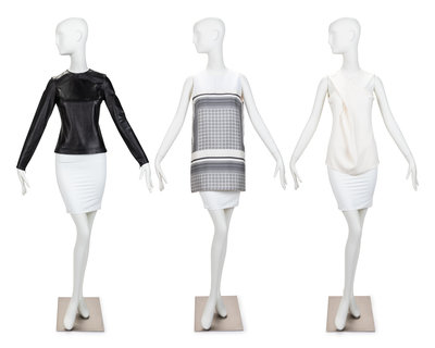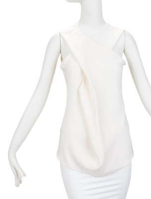 White silk sleeveless faux wrap top with v-neckline, asymmetrical hem, and center back zipper closure.