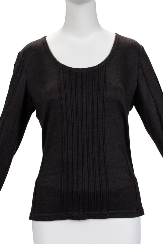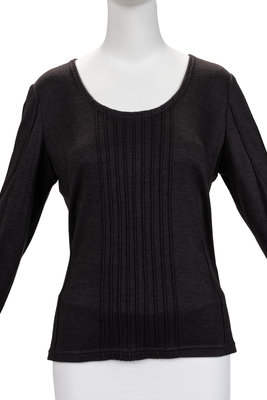 Grey cashmere/silk blend knit top with wide neckline, set in long sleeves, center front and back vertical piping detail, and center back zipper closure.
