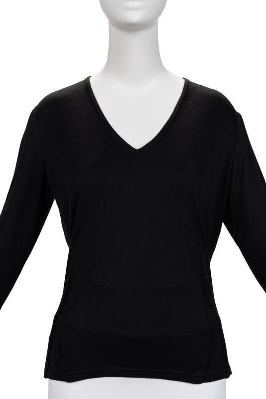 Black cashmere/silk blend knit top with v-neckline, set in long sleeves, triangular paneling details, and center back zipper closure.