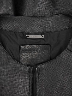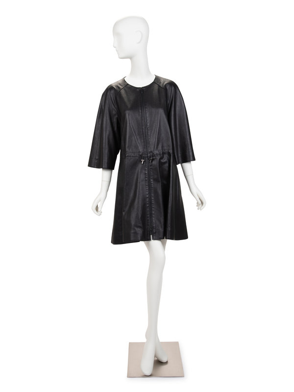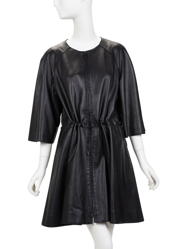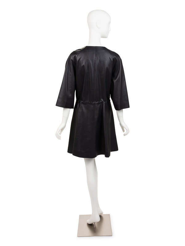 Black lamb leather coat with jewel neckline, raglan three quarter length sleeves, drawstring waist with flared skirt, two side zipper pockets, and front zipper closure.