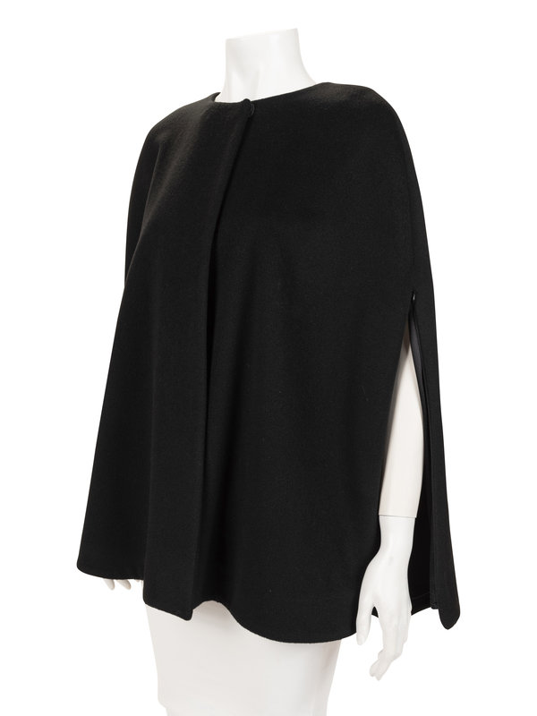 Black wool cape with crew neckline, two side zippers, large center back pleat, and double front snap closure.