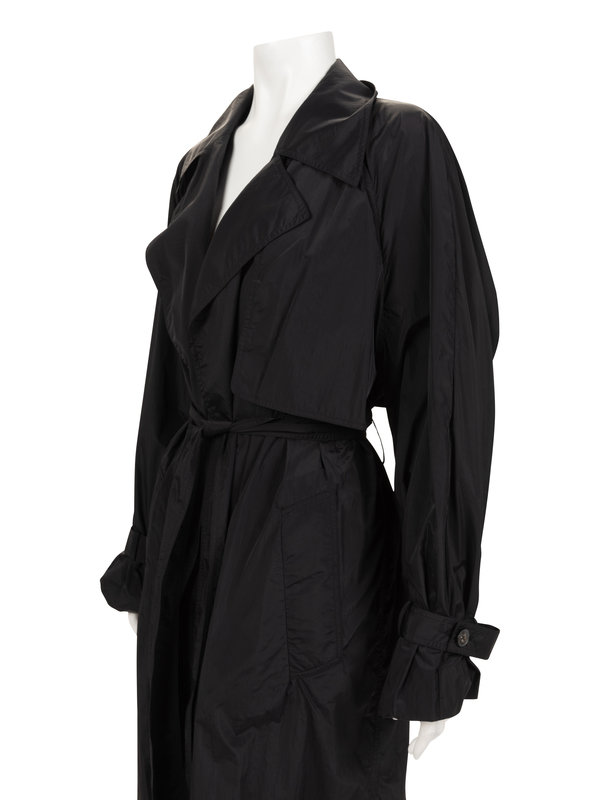 Black nylon long coat with notched lapel, raglan long sleeves, two side welt pockets, front and back storm flap, large back vent, and detachable belt closure.