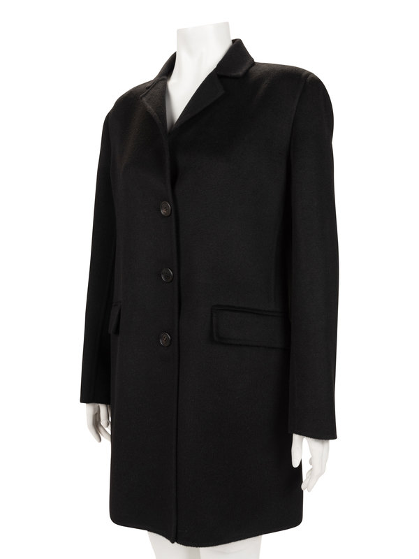 Black wool/angora blend coat with notched lapel, set in long sleeves, back vent, two front flap pocket, and front button closure.