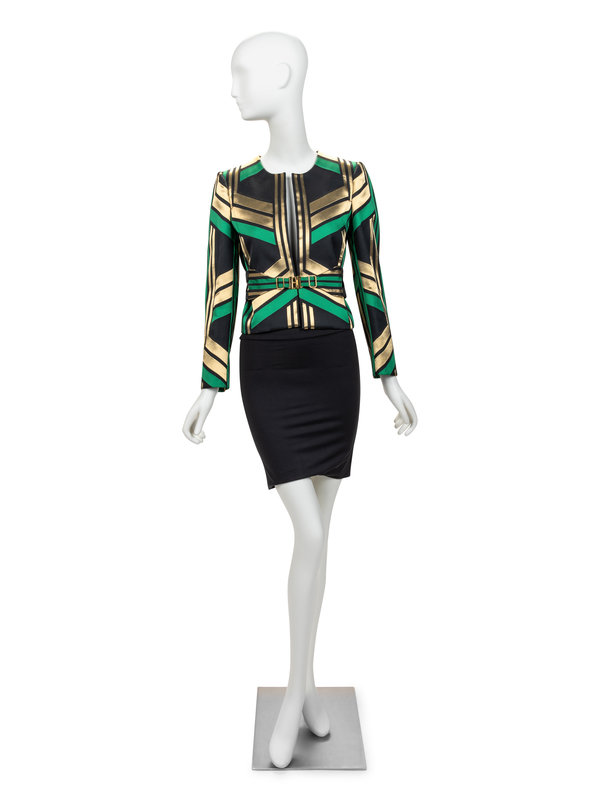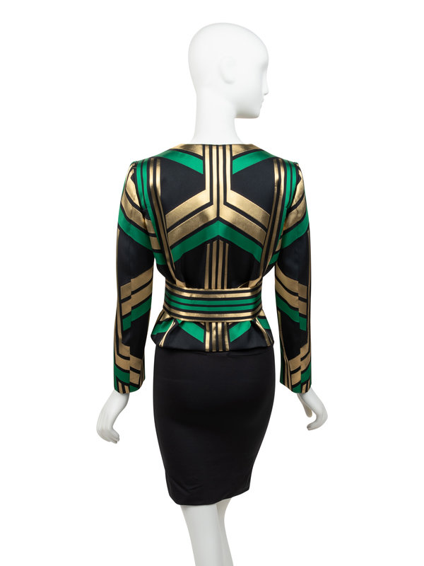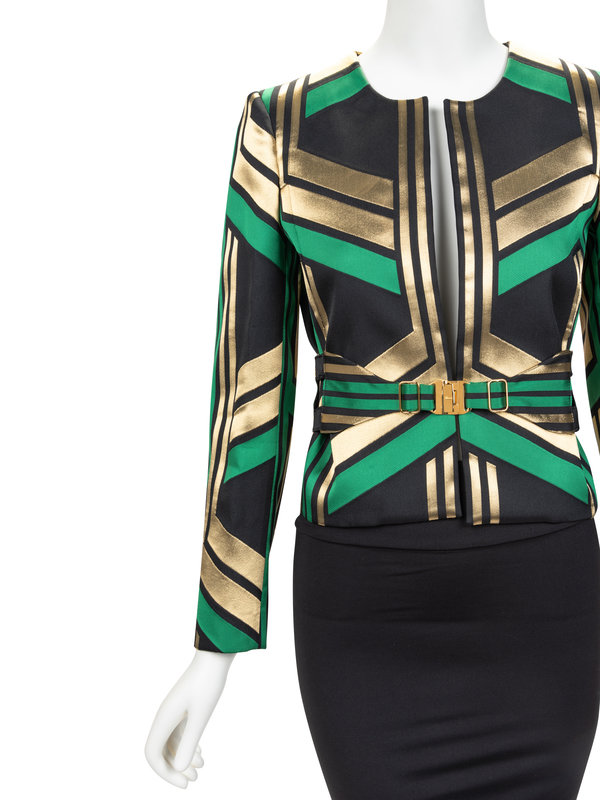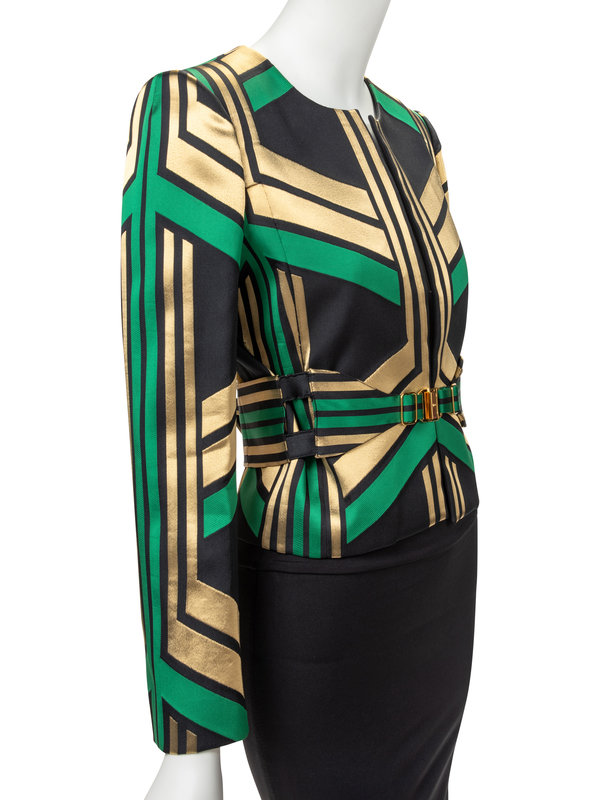 Green, black, and gold polyester jacket with geometric woven design, jewel neckline, set in long sleeves, and open front; paired with matching belt with gold-tone buckle.