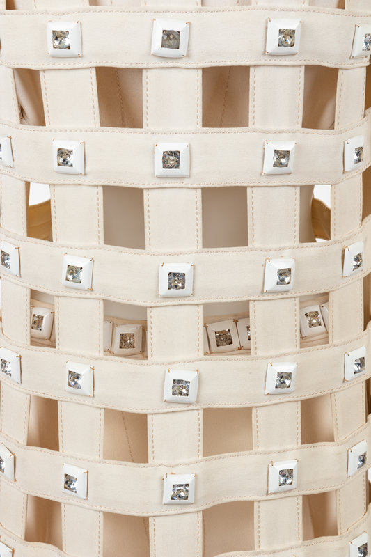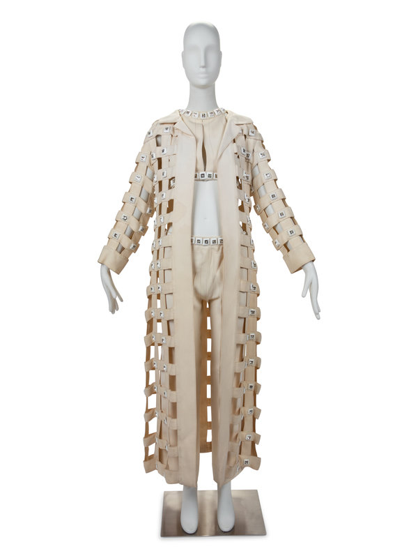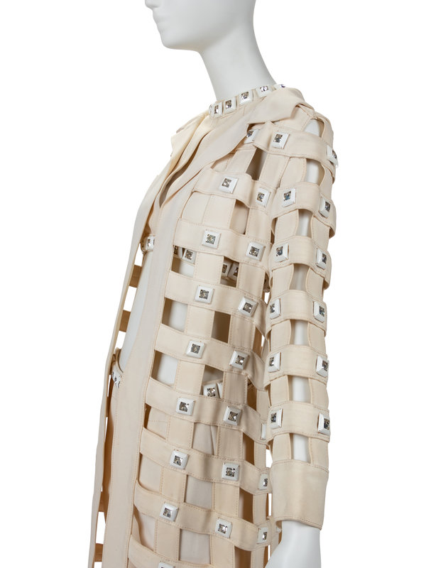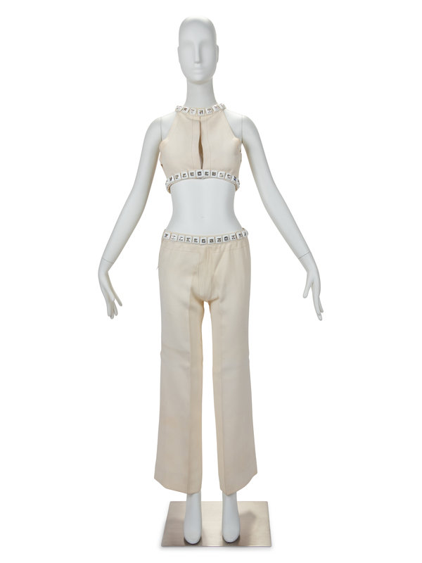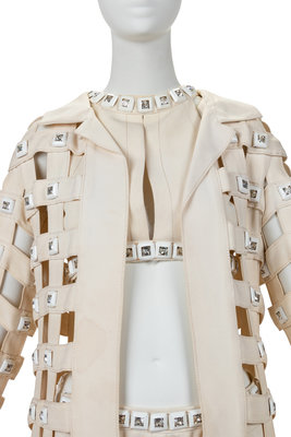 Cream woven lattice jacket embellished with white plastic square "sequins" with large rhinestones sewn into the center of each square, notched lapel, and open front; paired with matching crop top with front keyhole cut out and side cut outs, trimmed with the same embellishment as the jacket, and hook and eye back closures, with matching pleated pants, also trimmed with the same white squares and rhinestones.