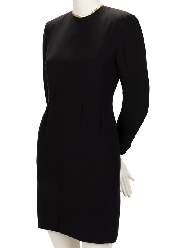 Black woven dress with jewel neckline, metallic gold trim, set in long sleeves with uneven hems, waist tucks, and center back zipper closure.