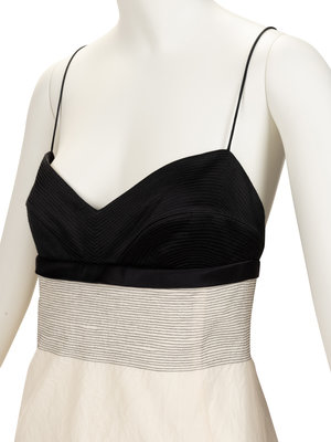 White wool crossed spaghetti strap dress with black bodice, black striped top stitching detail, empire waistline, and center back zipper closure. This item retains the merchandising labels listing the retail price at $2,195.00.