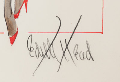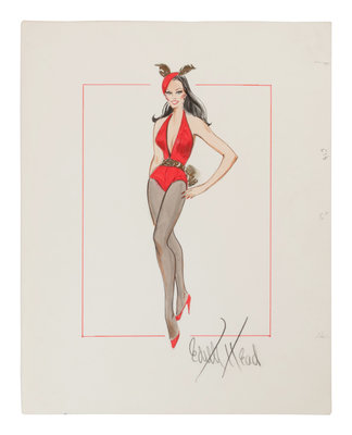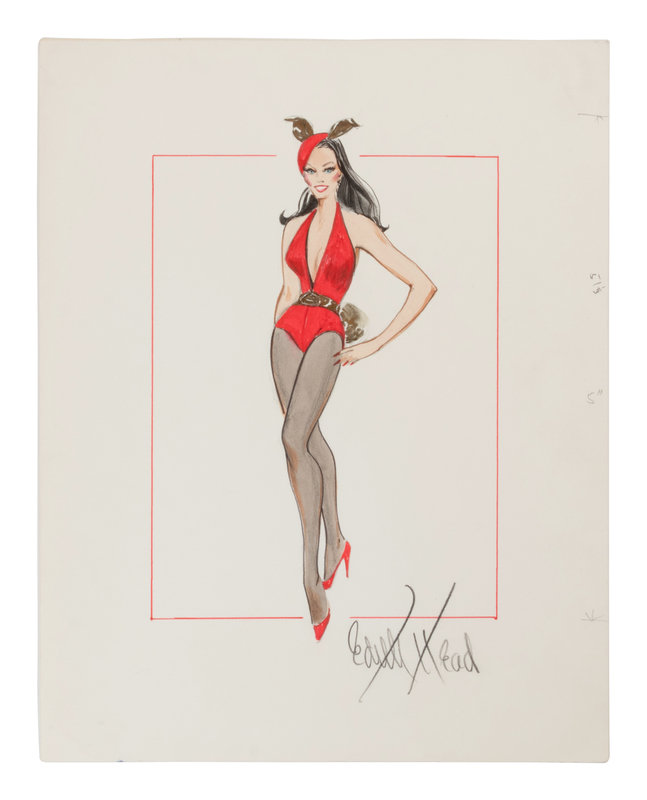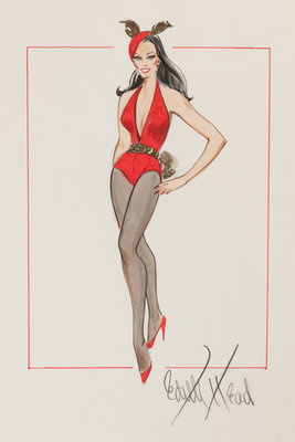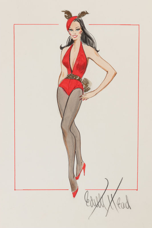 Edith Head illustration of a woman wearing a red bodysuit, black tights, red heels, and bunny ears for Playboy. Signed by Edith Head.