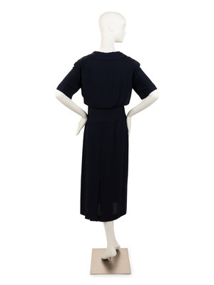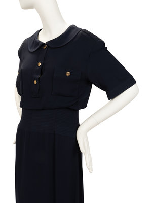 Blue crepe short sleeve dress with peter pan collar, two front patch pockets, waist band with top stitching trim detail, and invisible side zipper closure. Snaps on the inside of the neckline suggest the dress was worn with a detachable collar, but that collar is not included.